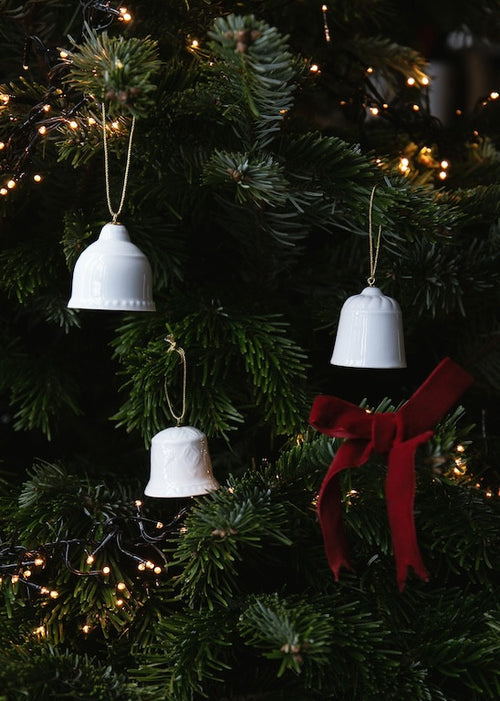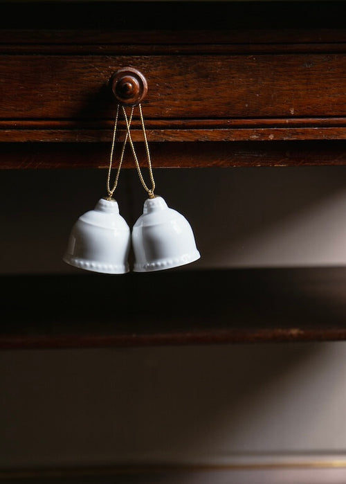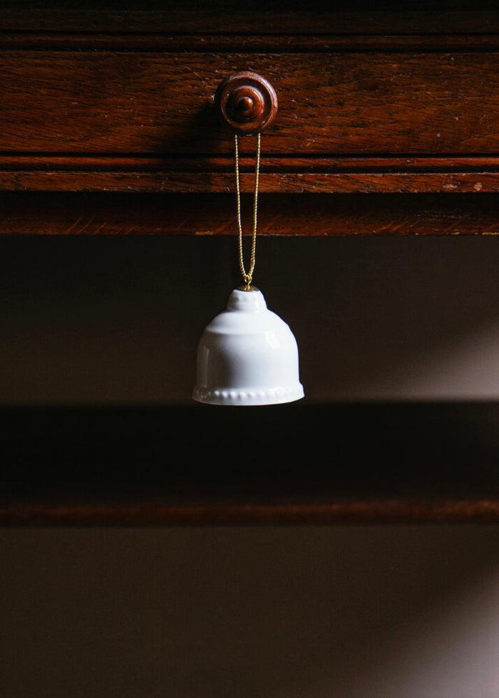 Que ce soit Angkor, Volga ou encore Esmeralda, ces clochettes faites à la main en porcelaine de Limoges sont agrémentées d'un petit grelot. Elles peuvent être suspendues à une poignée de porte, au sapin de Noël ou encore offertes à Pâques pour une décoration subtile et élégante. La clochette Angkor est la version miniature de notre luminaire du même nom.