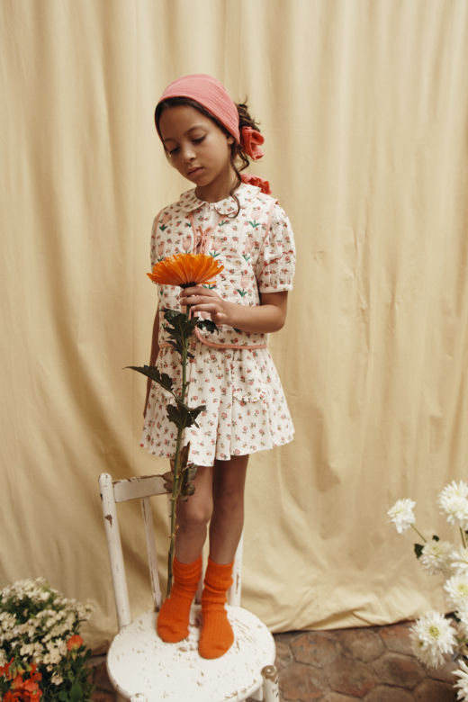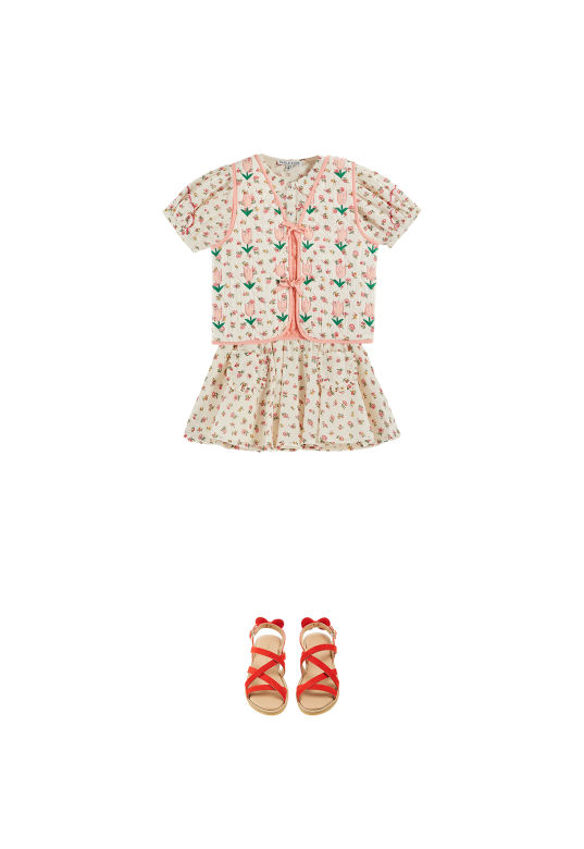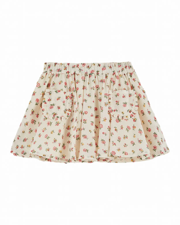 Jupe courte en coton écru imprimée de fleurs rose. Vous apprécierez la qualité et la finesse de la matière toute douce et la forme ample que procurent les fronces soutenues par une ceinture élastiquée avec un effet volanté et les poches plaquées entourées d'un froufrou qui dissimuleront le moindre trésor.
