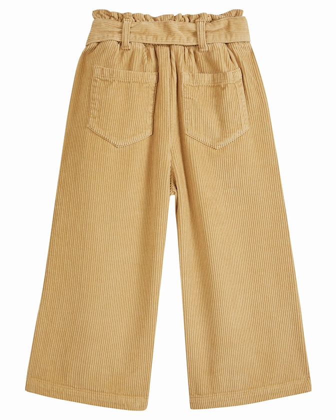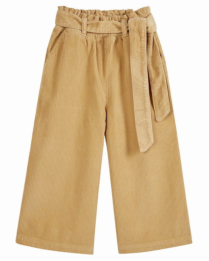 Pantalon cropped en velours de coton côtelé beige. Pantalon confectionné dans une matière douce et moelleuse, monté sur une large ceinture élastique. Coupe large, ceinture à nouer, poches plaquées et surpiquées sur les fesses italiennes devant, autant de petits détails qui agrémentent ce pantalon cropped. Un pantalon dont les grosses côtes sont beaucoup moins difficiles à monter que celles du tour de France. Il tient chaud et se laisse adopter dès lors qu'il est caressé dans le sens du poil !