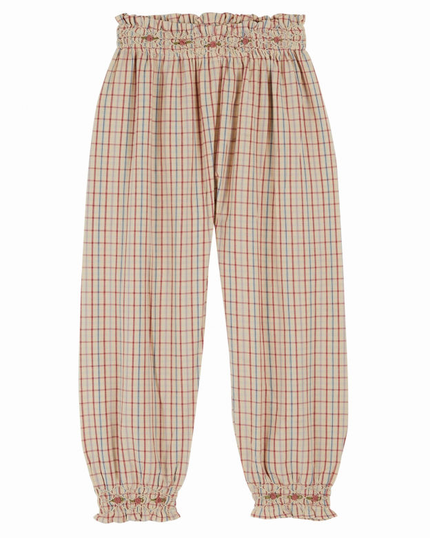 Découvrez notre pantalon en coton vanille à carreaux, embelli de lignes rose, bleu, et rouge. Ce pantalon se distingue par son graphisme unique généré par les lignes de différentes largeurs.