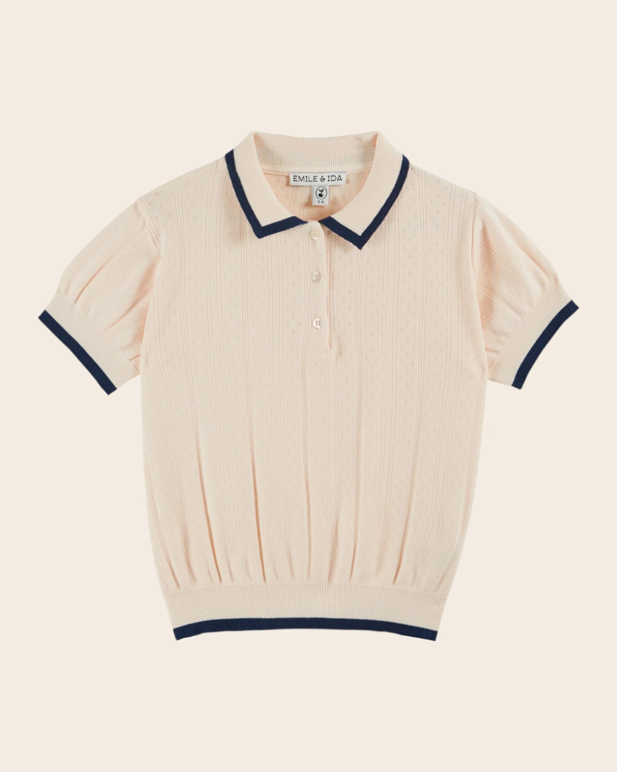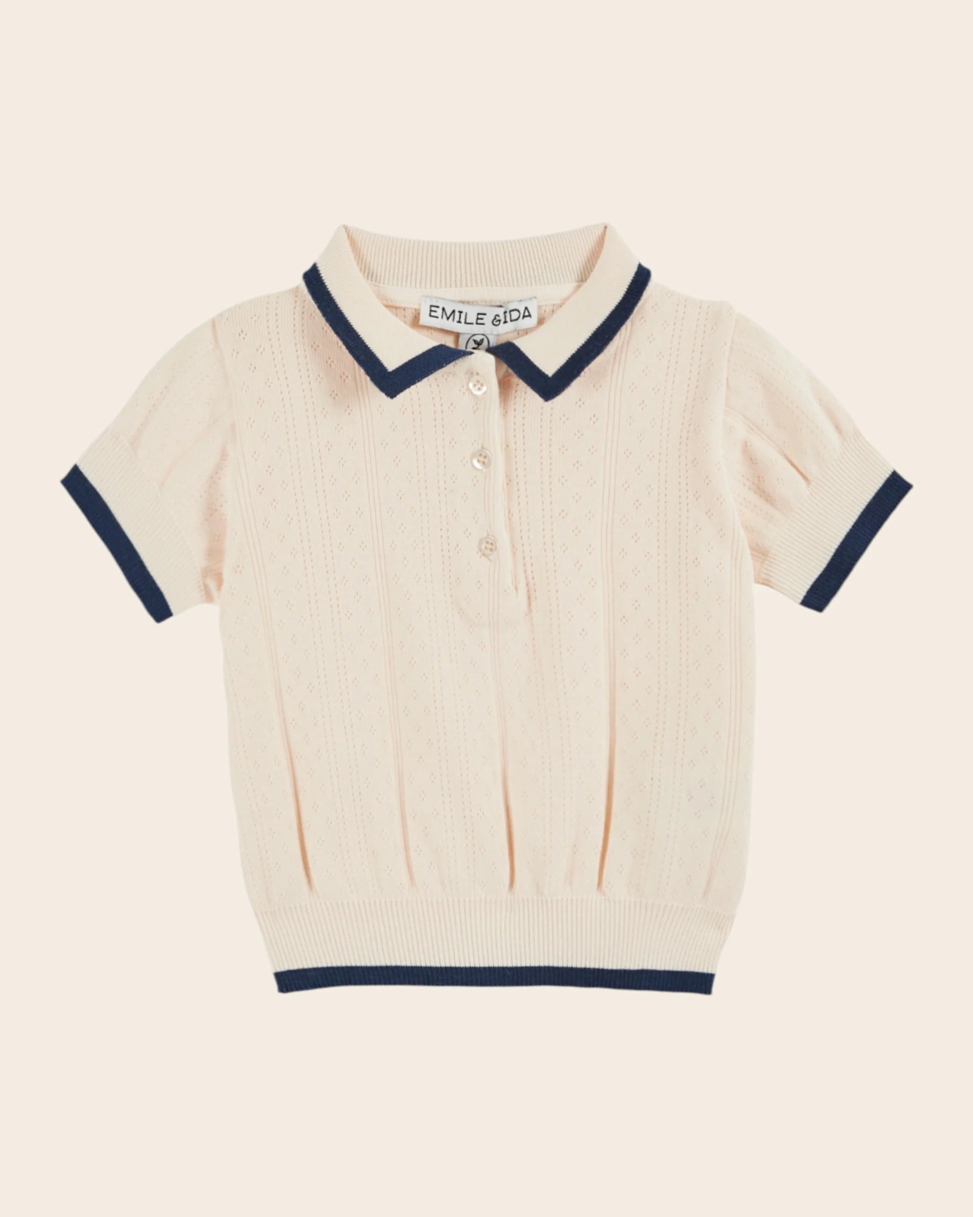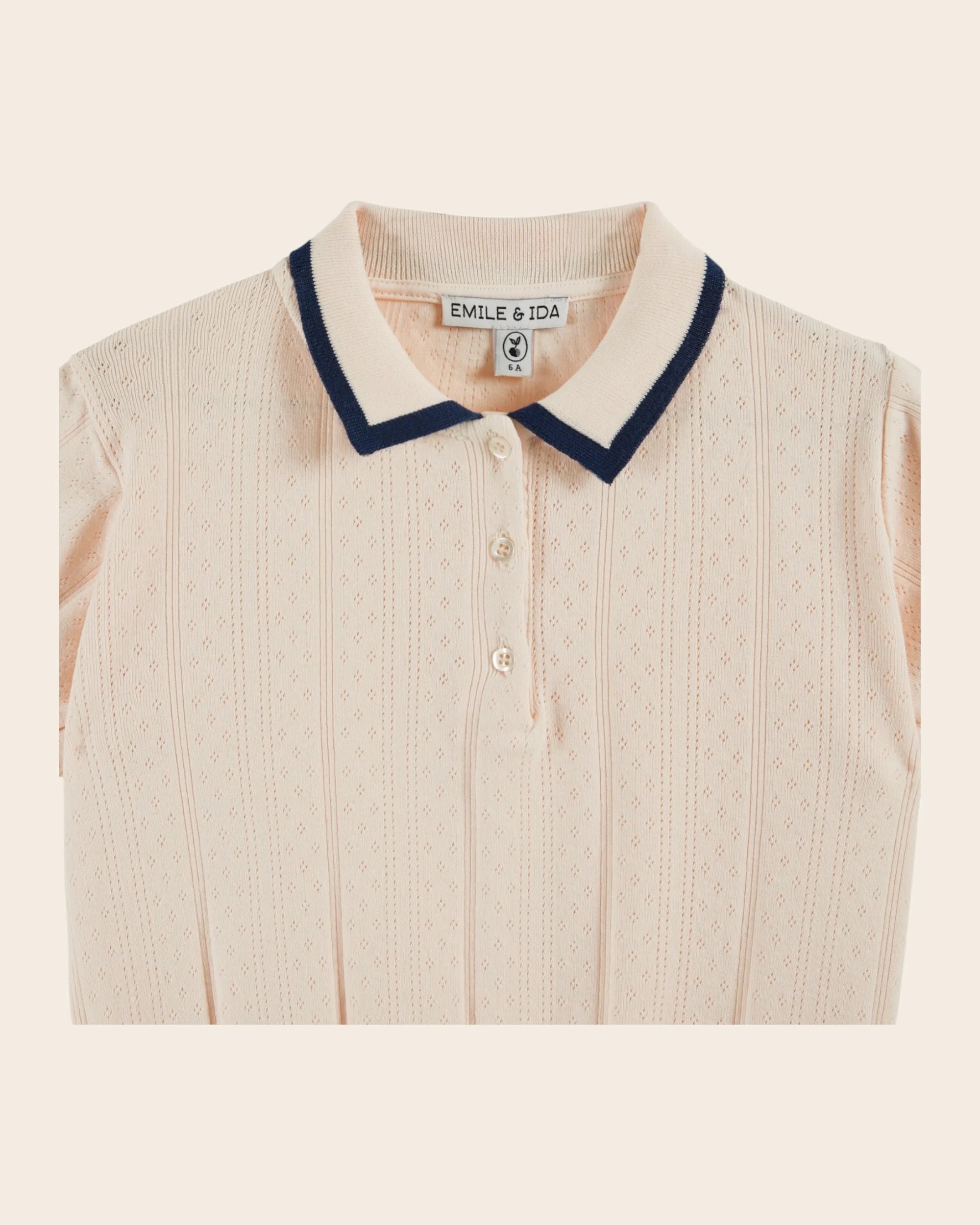 Polo en côtes de coton et modal crème. La répétition des motifs ajourés en mailles pointelles dynamise la couleur unie.