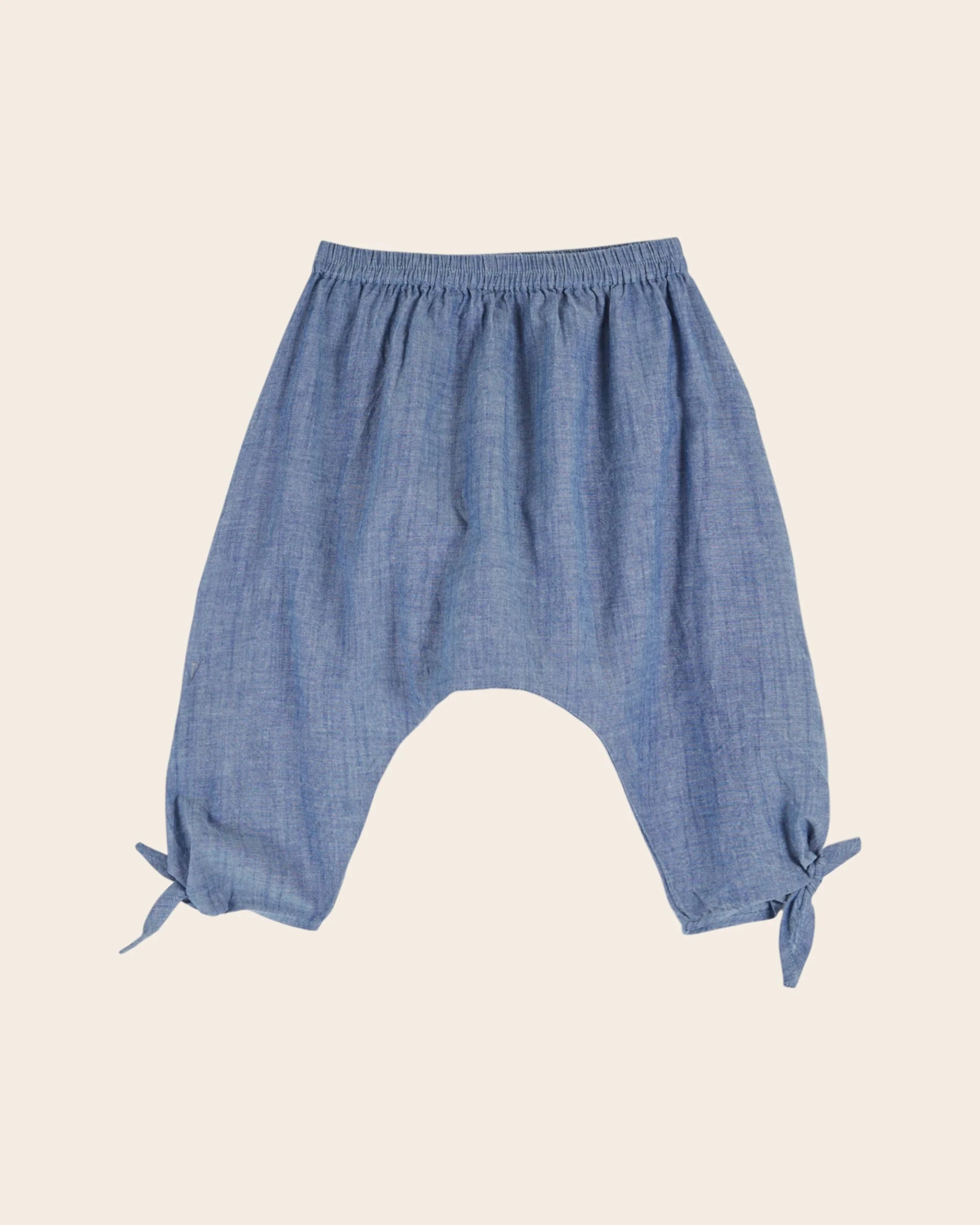 Bloomer en coton chambray bleu chiné. Porté avec un tee-shirt il s'adapte aux bébés garçons ou filles, porté sous une robe, il achève le look des bébés filles.