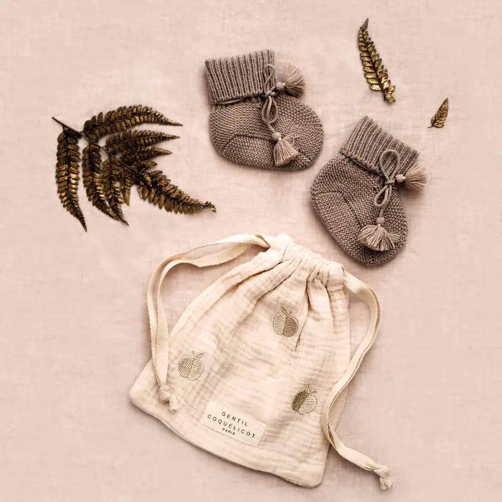 Adorable paire de chaussons en maille bébé. Un coloris Taupe mixte et intemporel qui se mariera à toutes les premières tenues de bébé. Ces chaussons bébé sont bien pensés et maintiennent le pied de l’enfant grâce au lien de serrage, au bout de ces liens de coton d’adorables pompons en laine réalisés à la main. Une création unique Gentil Coquelicot et dans une taille unique 0-6 mois qui vous assure de les utiliser plusieurs mois. Un pochon brodé d’hirondelles en gaze accompagne cet essentiel bébé pour ranger les chaussons ou ses petites affaires. Vous allez adorer.