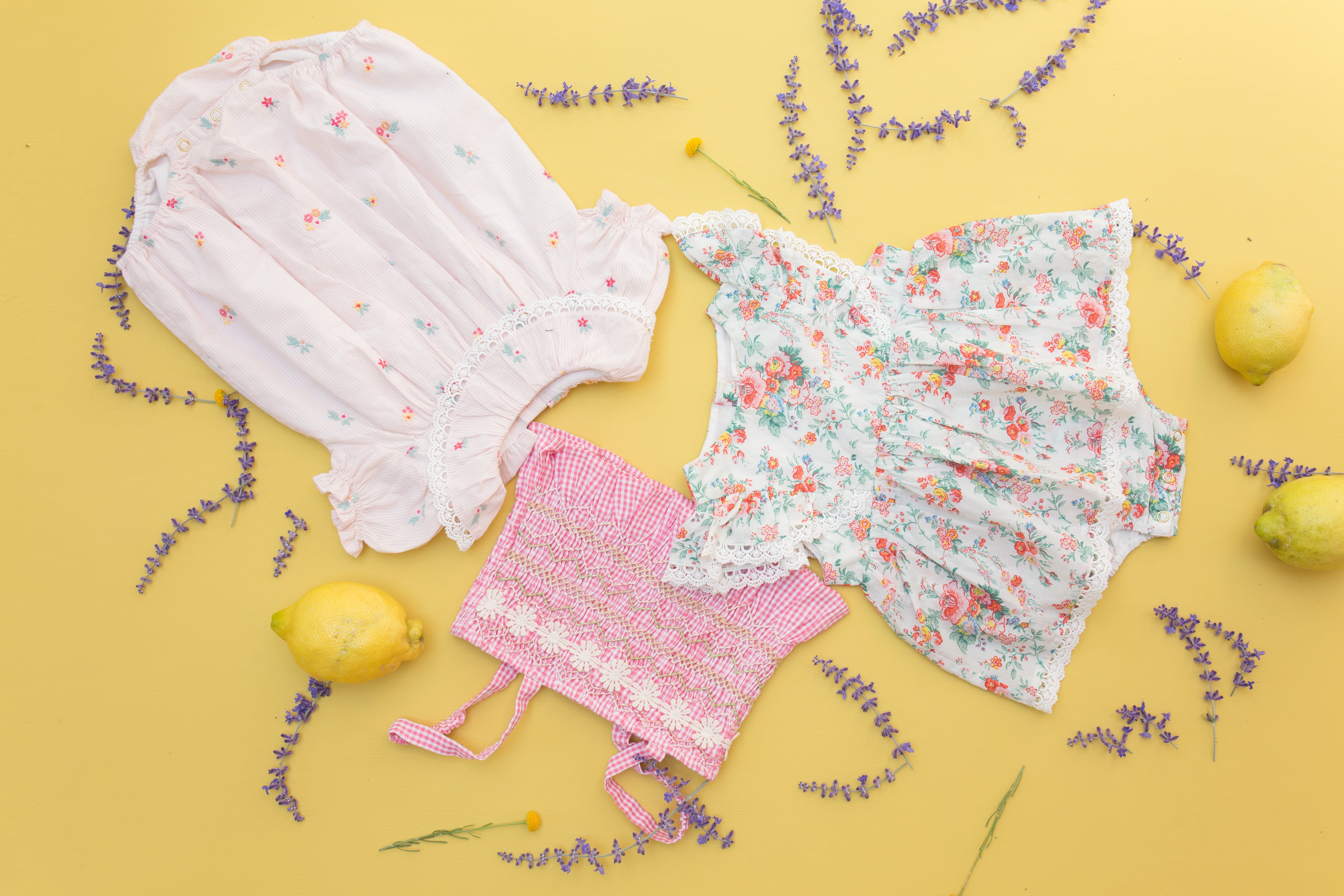 - Broderies et smocks faits main avec dentelle fleurie.