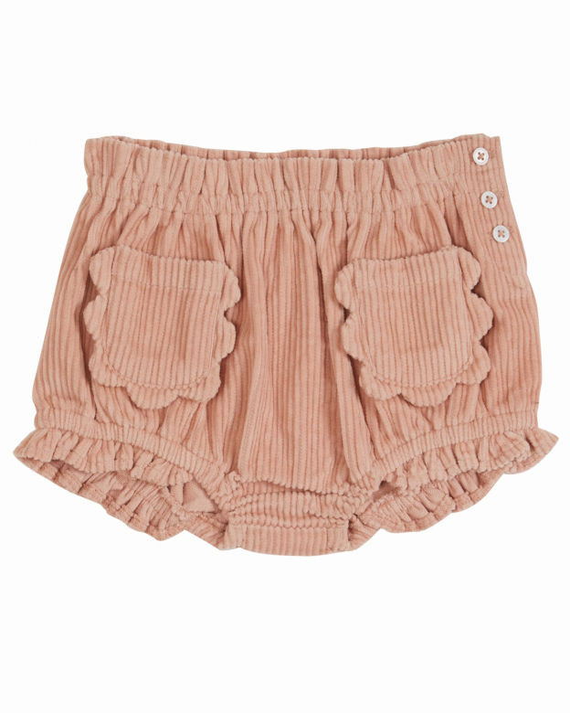 Bloomer en velours de coton milleraies rose poudré. Un joli bloomer élastiqué à la taille et aux cuisses volantées. On aime les poches fleurs, les fines côtes du velours tout doux, tout souple et surtout bien chaud pour prémunir les bébés du froid de l'hiver. Sur le côté, une patte de boutonnage et 3 boutons en nacre naturelle ferment cette culotte.