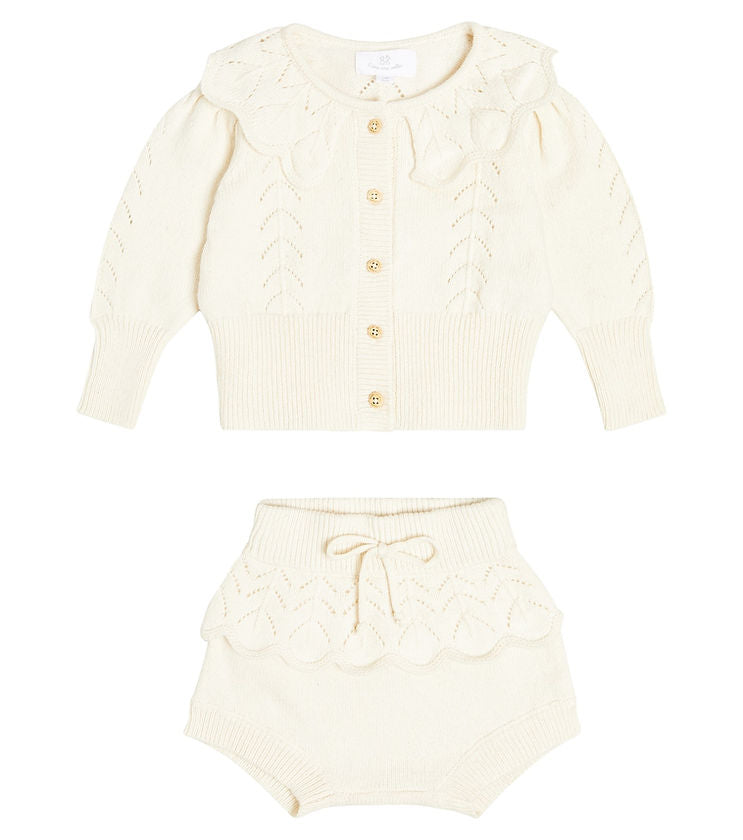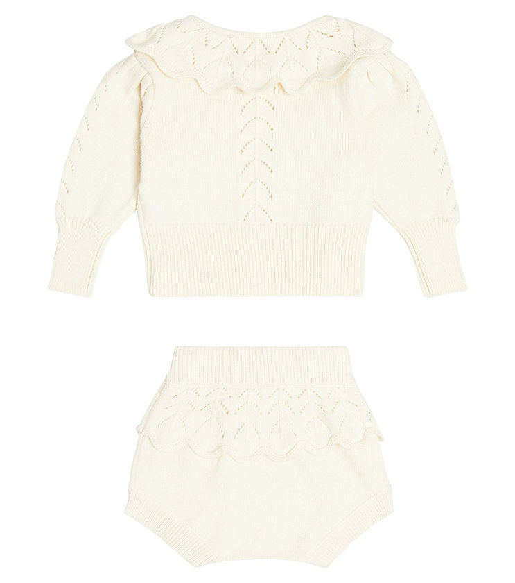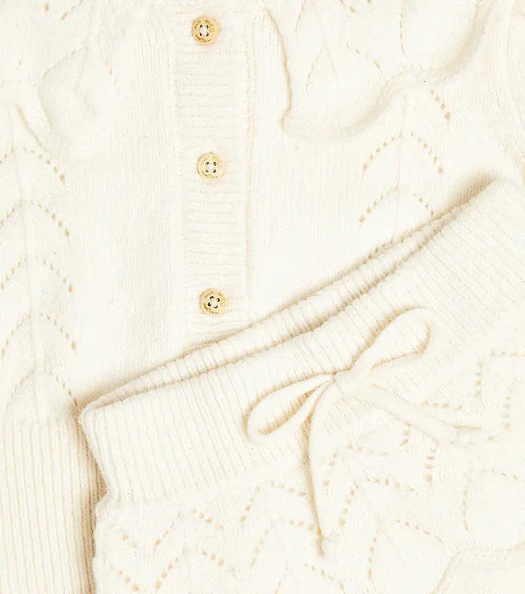 Réalisé en coton mélangé, l’ensemble léger Francesca se compose d’un cardigan et d’un short, tous deux rehaussés de détails inspirés du crochet, et s’achève sur des bords côtelés.