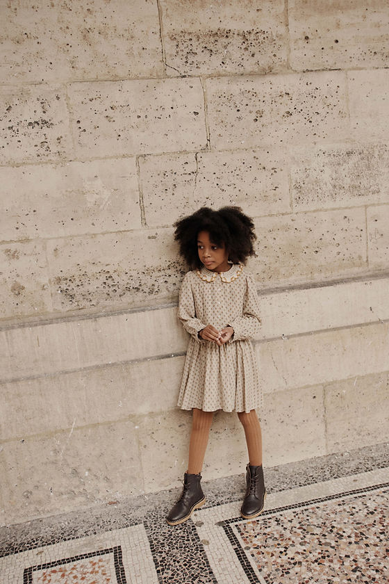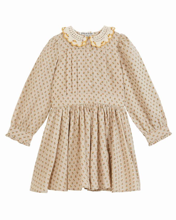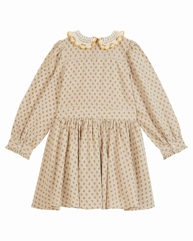 Robe en coton dont le fond beige est parsemé de fleurettes ocre jaune. Le petit empiècement passepoilé ton sur ton du corsage soutient le dos plat et les trois plis couchés de chaque côté de la patte de boutonnage. Les quatre panneaux de la jupe froncés sont montés sur une ceinture qui structure la robe entièrement doublée en voile de coton écru. Les fronces en tête de manches donnent l'ampleur qui est reprise aux poignets similaires à la ceinture, le petit froufrou en plus. Le col Claudine crocheté est brodé de motifs floraux ocre jaune.