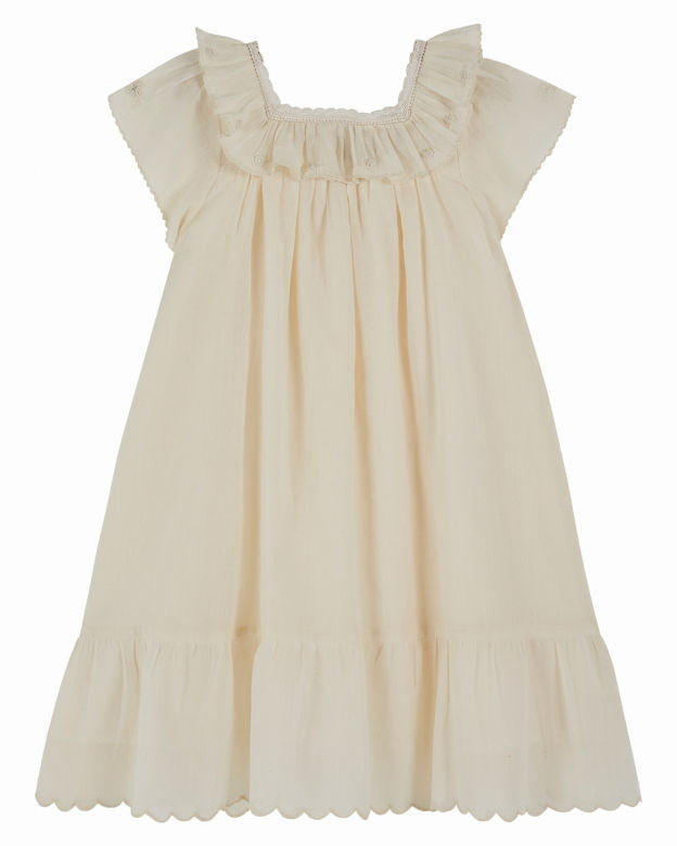 Découvrez notre robe en gaze de coton écrue, un symbole de délicatesse et de légèreté. Un ruban de fine dentelle orné d'un jour échelle ceint l'encolure carrée, créant une collerette autour du cou et un volant gracieux au bas de la robe. Les manches et le col sont agrémentés de fleurs brodées à la main, tandis que des ourlets festonnés au point de bourdon ajoutent une touche d'élégance supplémentaire.