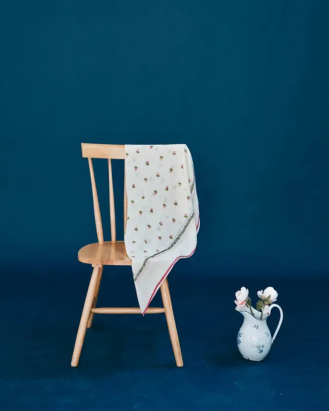 Foulard en laine écrue parsemée de petites roses. Un cadre vert entouré d'un cadre rose pâle, brodés à la main, cernent l'imprimé du centre. Le bord est terminé par un galon rose tyrien.