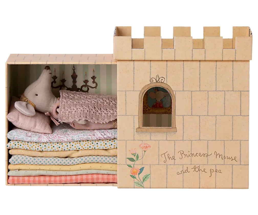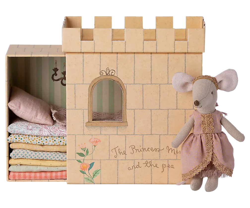 Cet ensemble est inspiré du célèbre conte de fées "la princesse et le pois", il est composé du château avec plusieurs matelas, un pois et une souris princesse. Combinez cet ensemble avec d'autres souris et accessoires Maileg pour plus de magie !