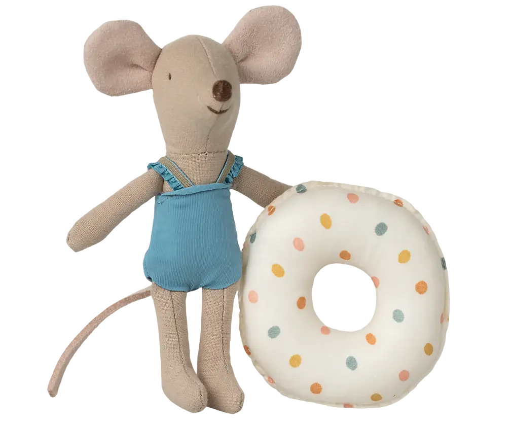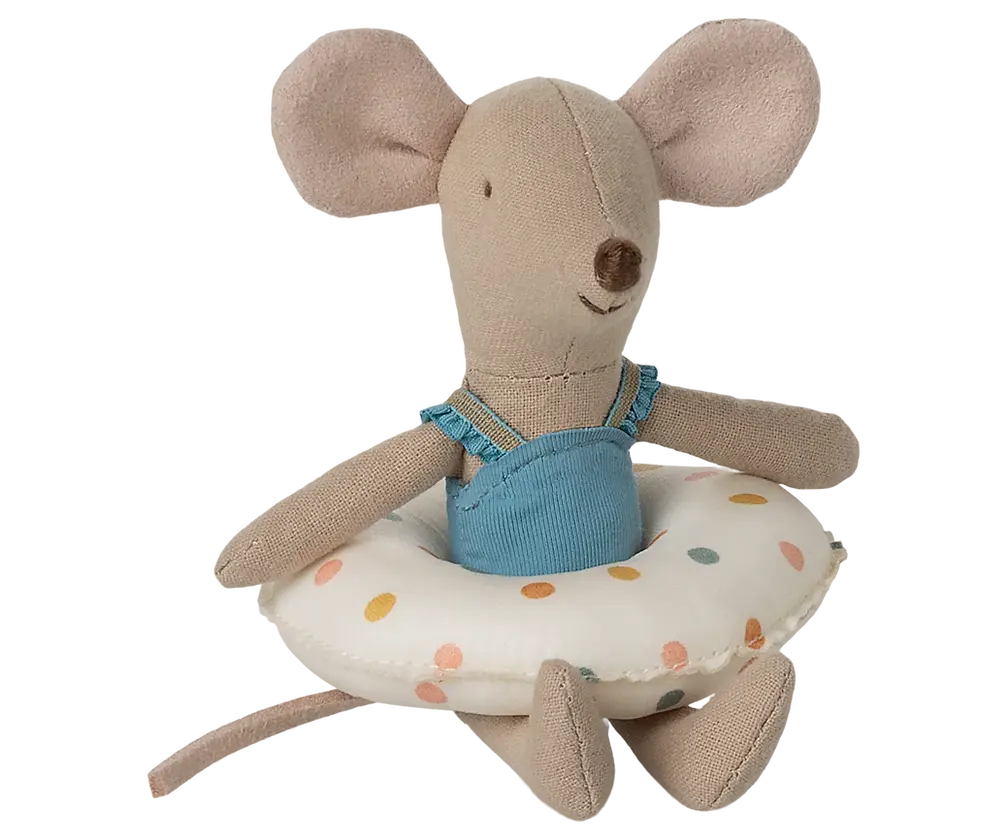 Ce jeu d'été est composé d'une petite sœur souris vêtue d'un maillot de bain bleu et de sa bouée à pois multicolores, portée autour de sa taille. Elle est maintenant prête pour une baignade en toute sécurité dans la mer.