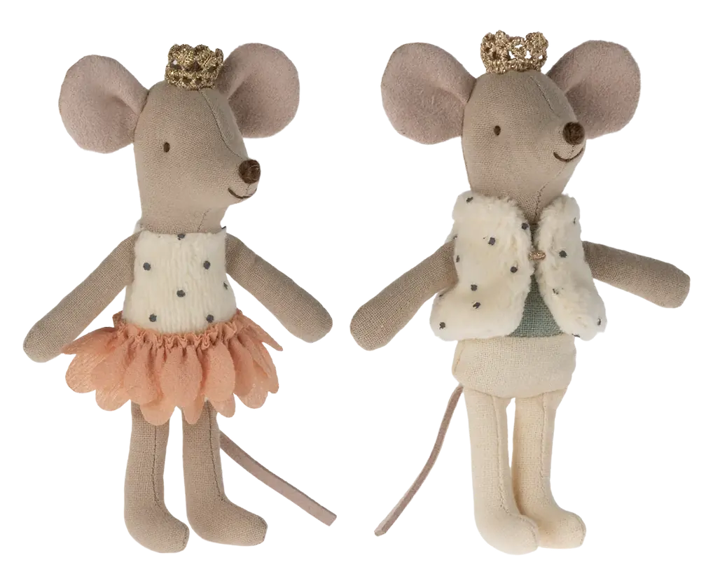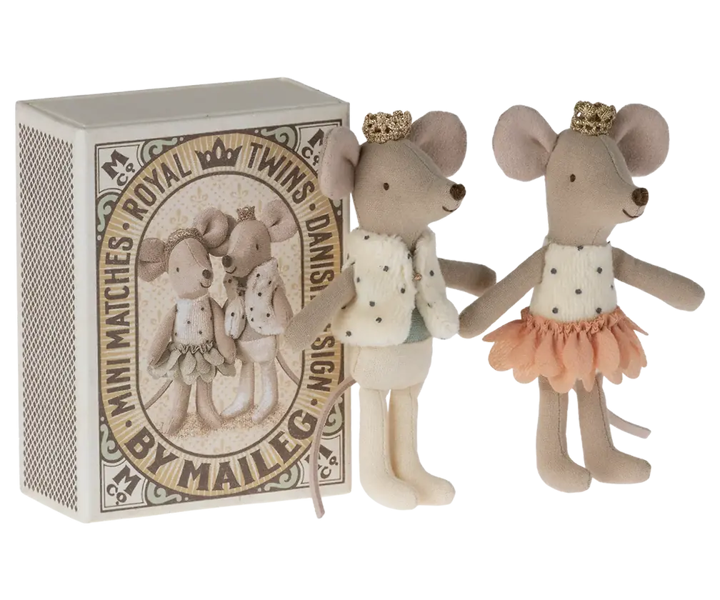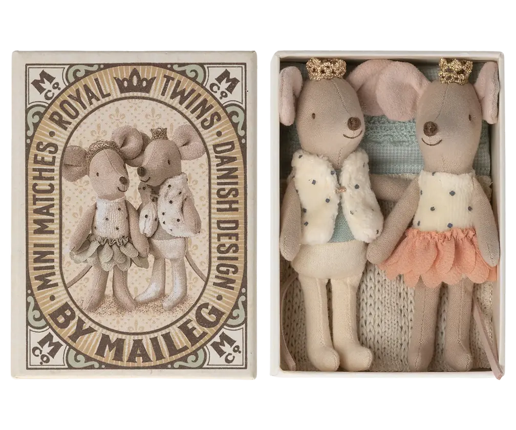 Les jumeaux royaux Maileg sont habillées de leurs plus beaux habits et de leurs couronnes dorées.
