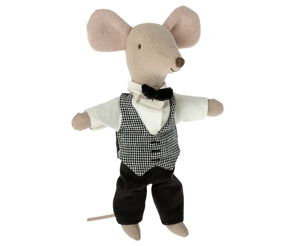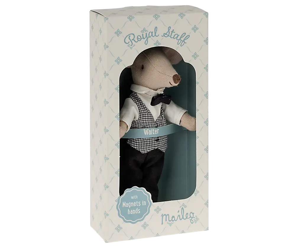 La souris serveur est l'aide parfaite à toute fête ou à la famille royale. Elle est habillée de manière classique et a des aimants dans les mains, il est donc plus facile de tenir tous les ustensiles en métal.