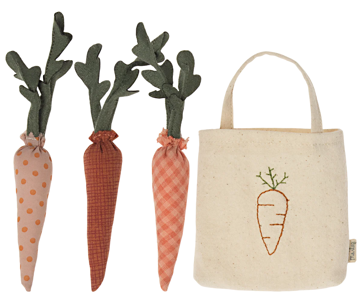 La collation préférée des lapins et des lapins. Ce petit sac contient trois carottes et est tout en tissu Maileg. Un accessoire doux qui encouragera encore plus de jeu.