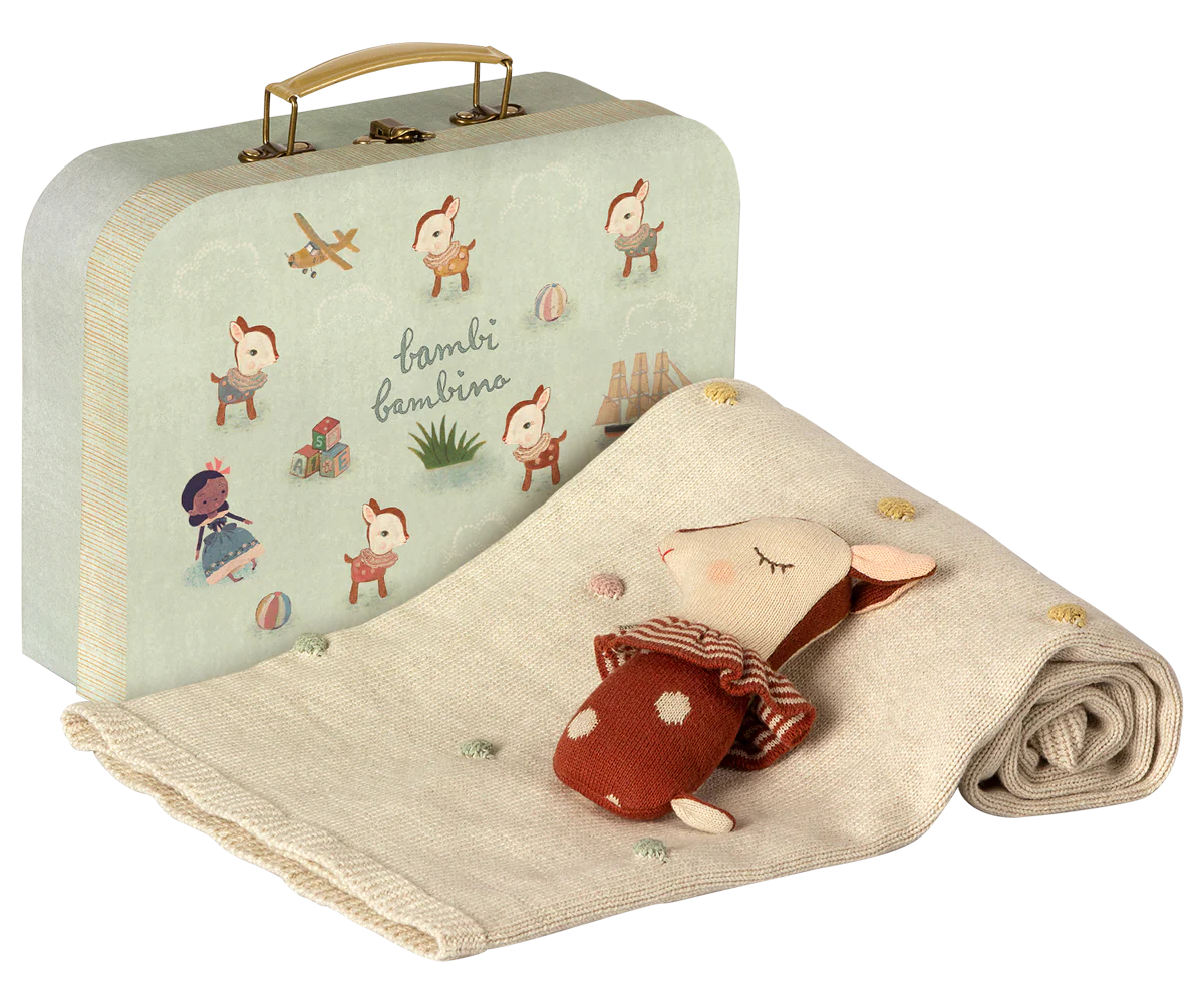Ensemble cadeau pour bébé qui comprend un hochet Bambi et une douce couverture en tricot, en coton. Emballé dans une valise artisanale joliment décorée.