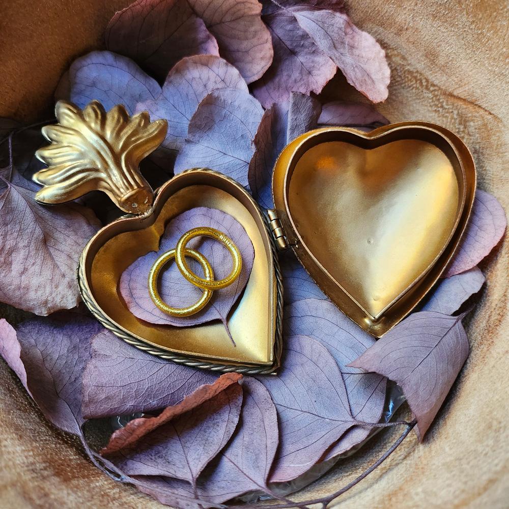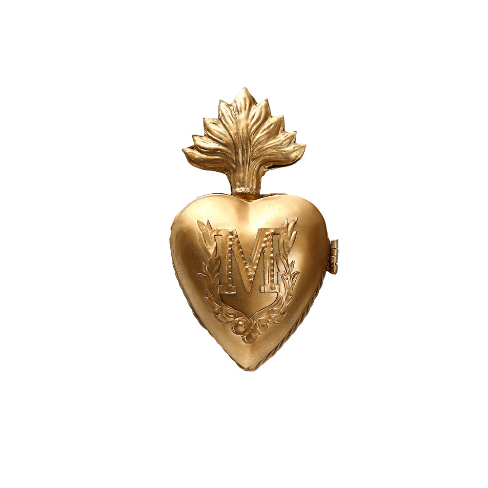 Boite coeur Mona en fer blanc patiné couleur or. À accrocher au mur ou à poser sur un meuble, elle gardera au chaud tous vos secrets et petits objets précieux. Composez une accumulation de coeur ex-votos et ornements muraux en laissant libre place à votre créativité!