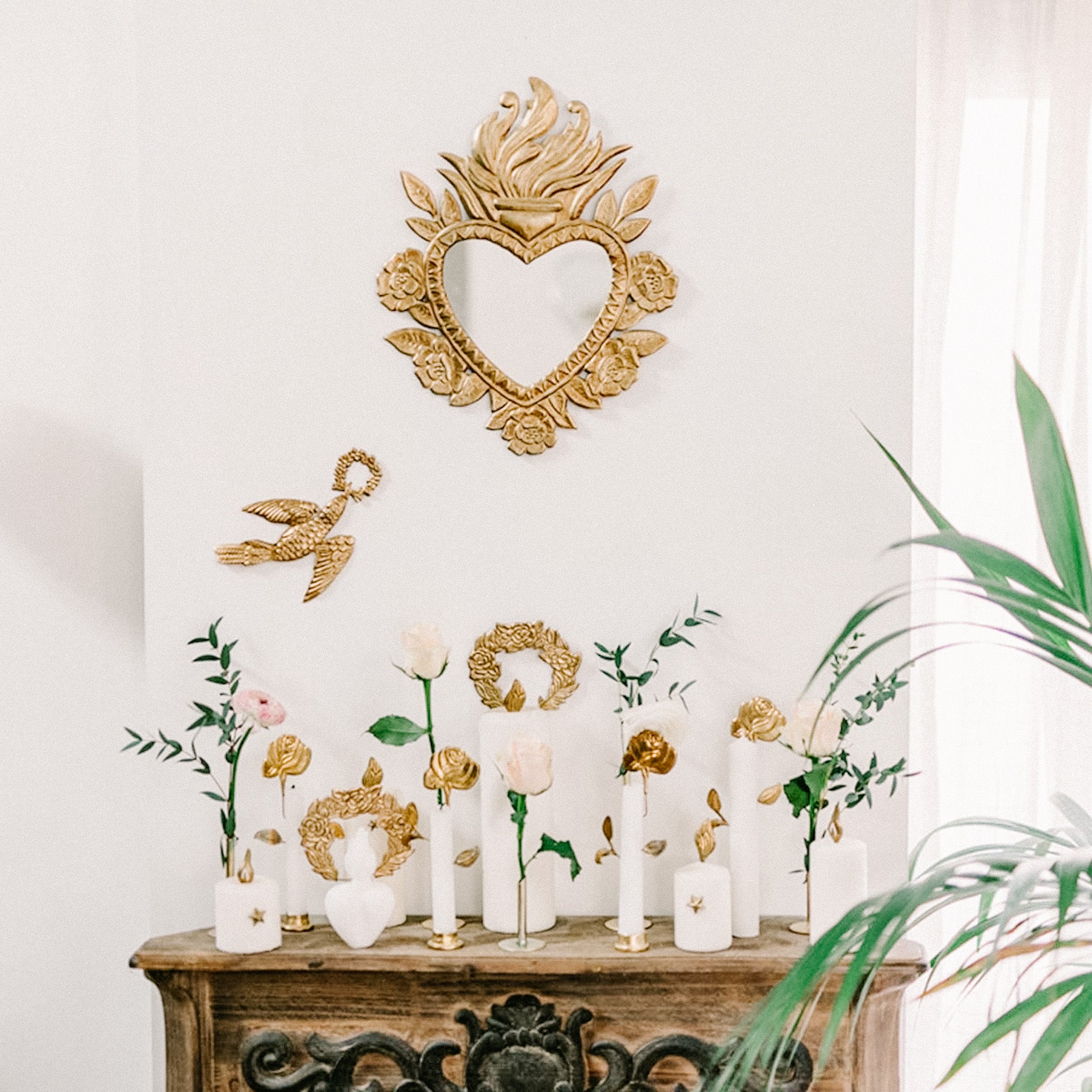 Miroir "Narcisse" à suspendre. Notre fameux mur d'ex-votos à reproduire chez vous. Accumulez coeur ex-votos, ornements et miroir pour une composition murale réussie.