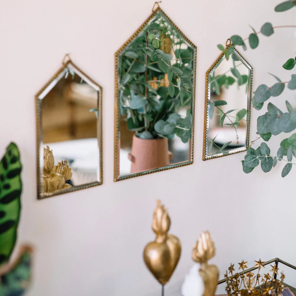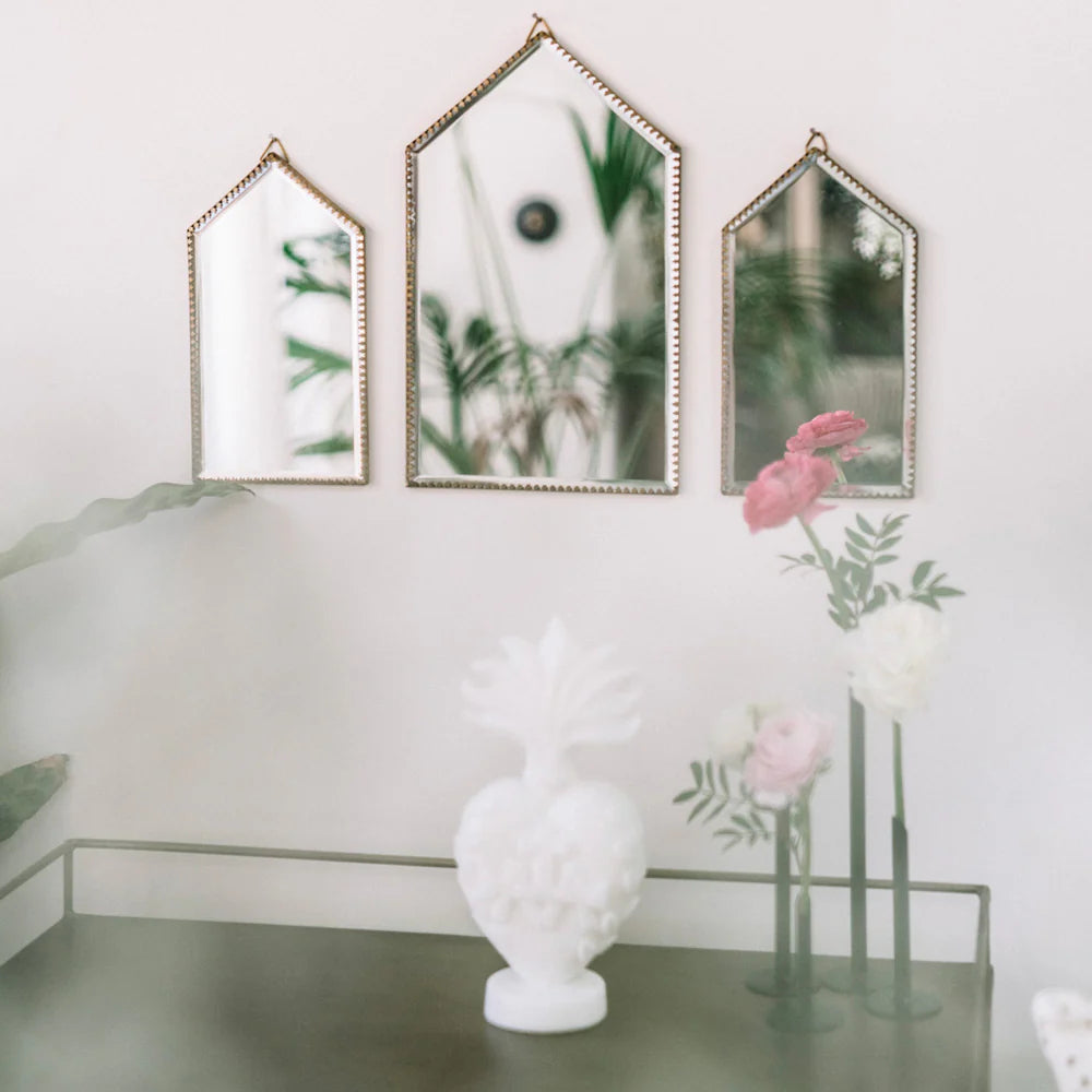 Accumulez coeur ex-votos, ornements et miroir pour une composition murale réussie.