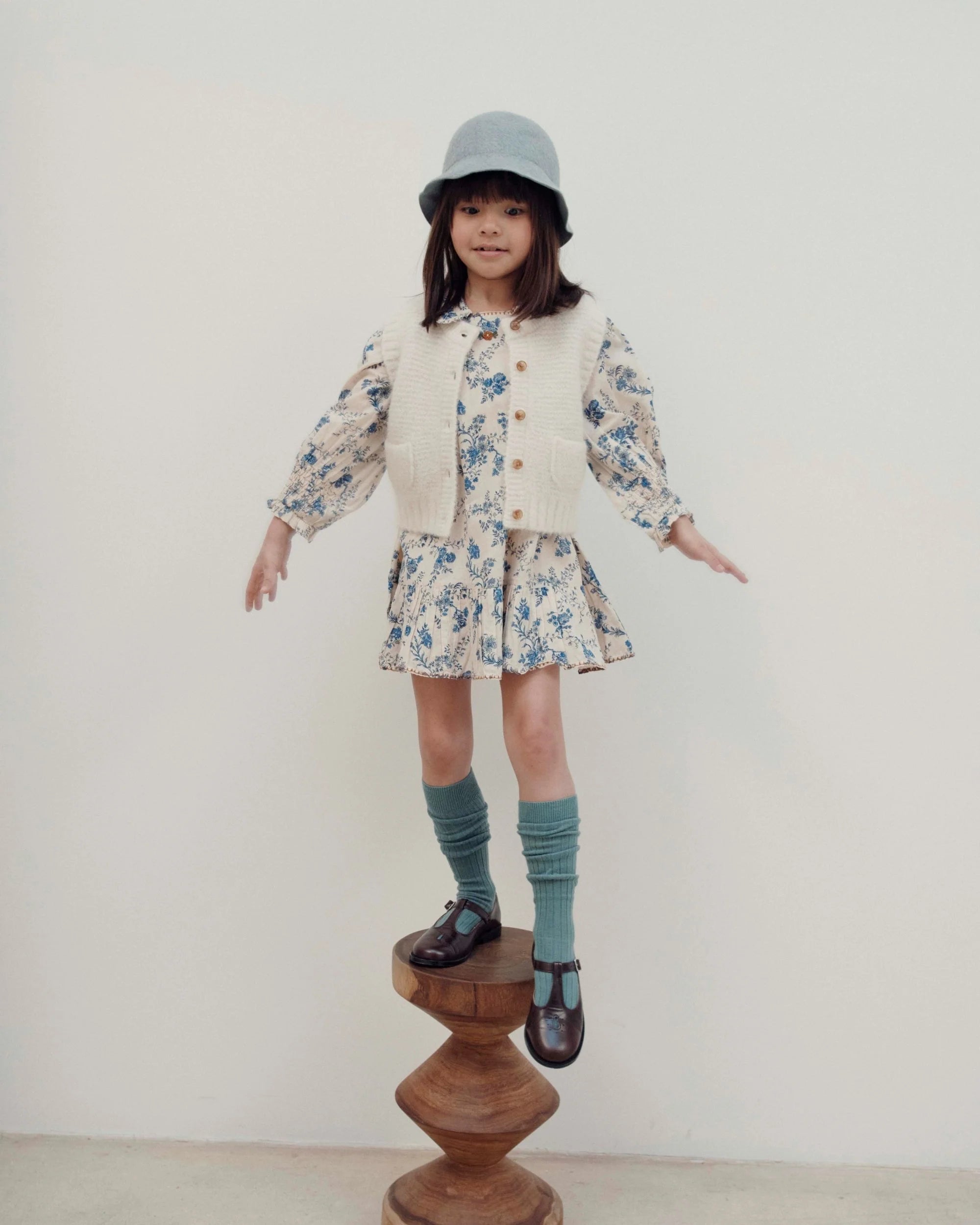 Cette robe enfant en flanelle de coton douce et naturelle est ornée d’un motif floral bleu sur fond écru, pour un style à la fois intemporel et poétique.