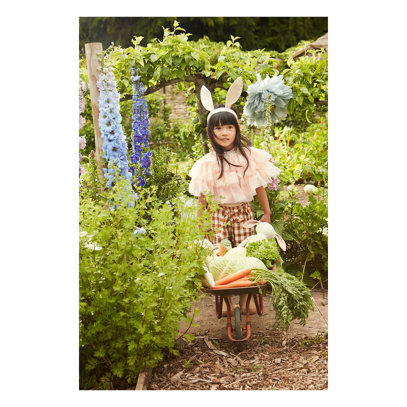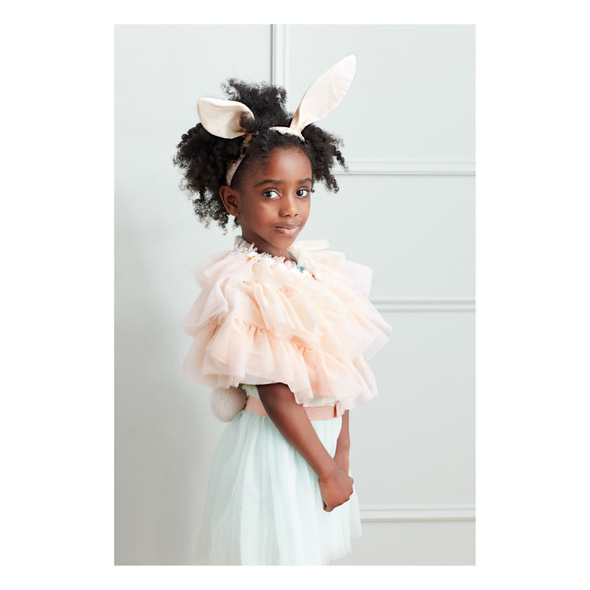 Ce beau costume de lapin est fabriqué à partir de tissus haut de gamme et de détails brodés - parfait pour les accessoires de Pâques ou de printemps. Il comprend trois pièces séparées - un bandeau avec des oreilles 3D, une cape en tulle en couches romantique et une ceinture en velours avec une queue de pompom douce.