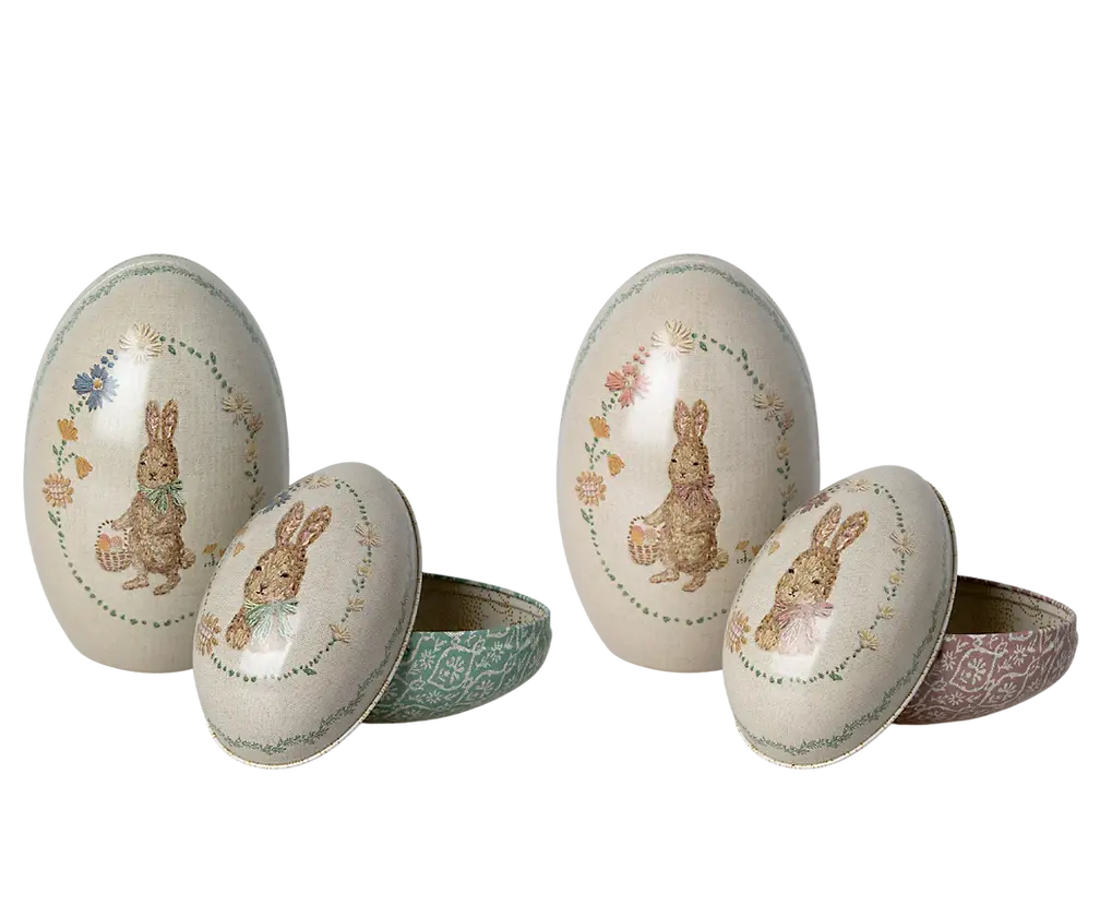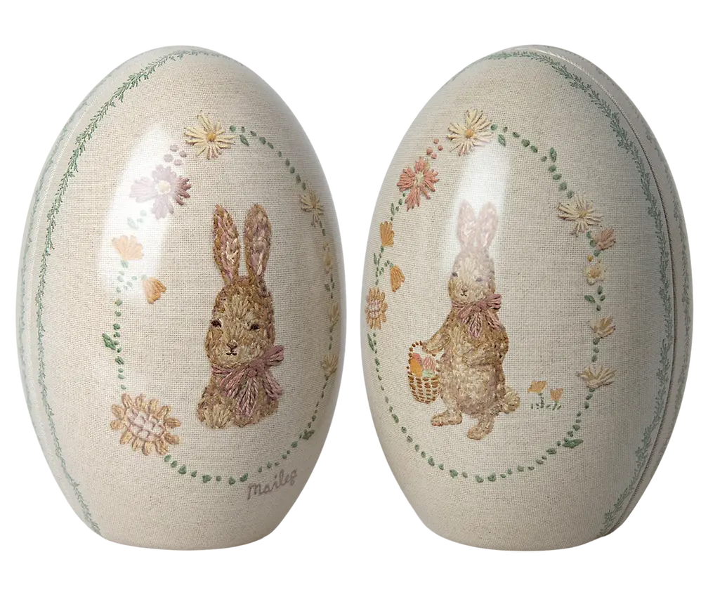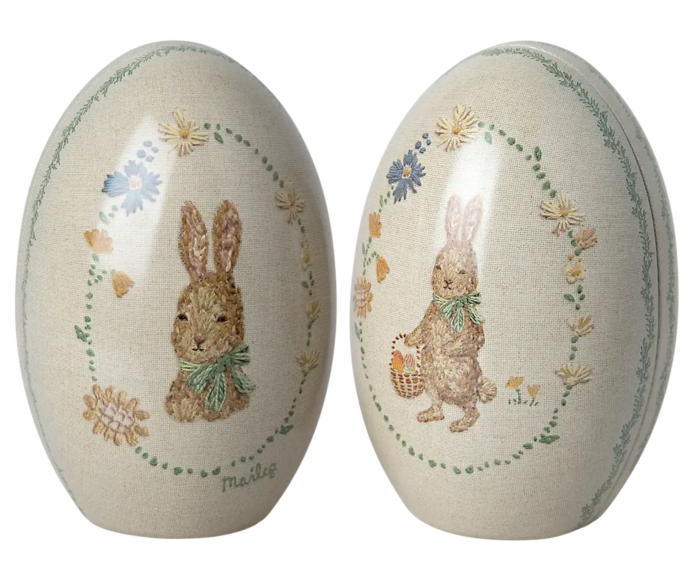 Ensemble de 2 œufs de Pâques en métal. Décorés d'une broderie de Dorthe Mailil et transformée en une magnifique impression sur les œufs - conformes à la réglementation européenne sur l'alimentation.