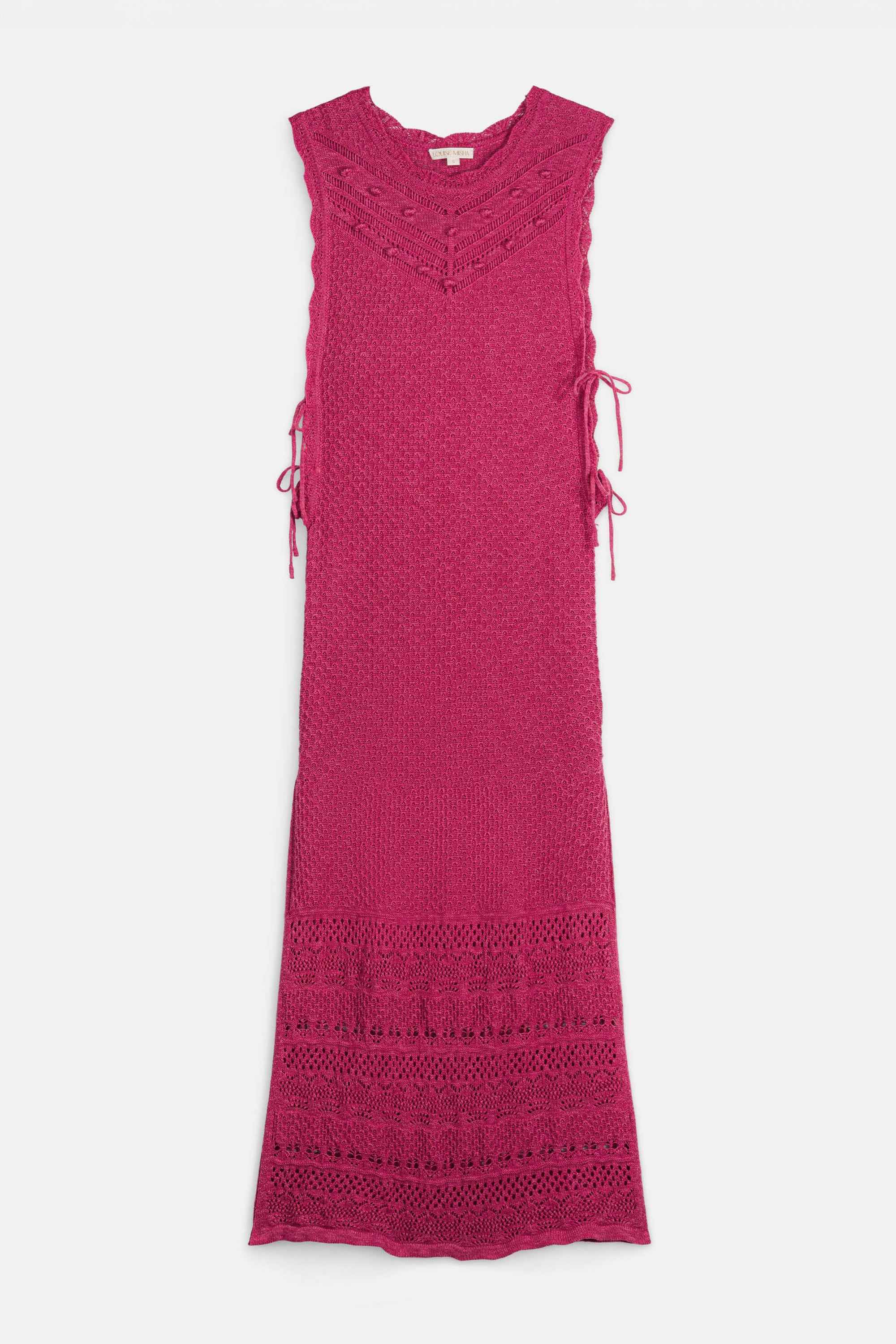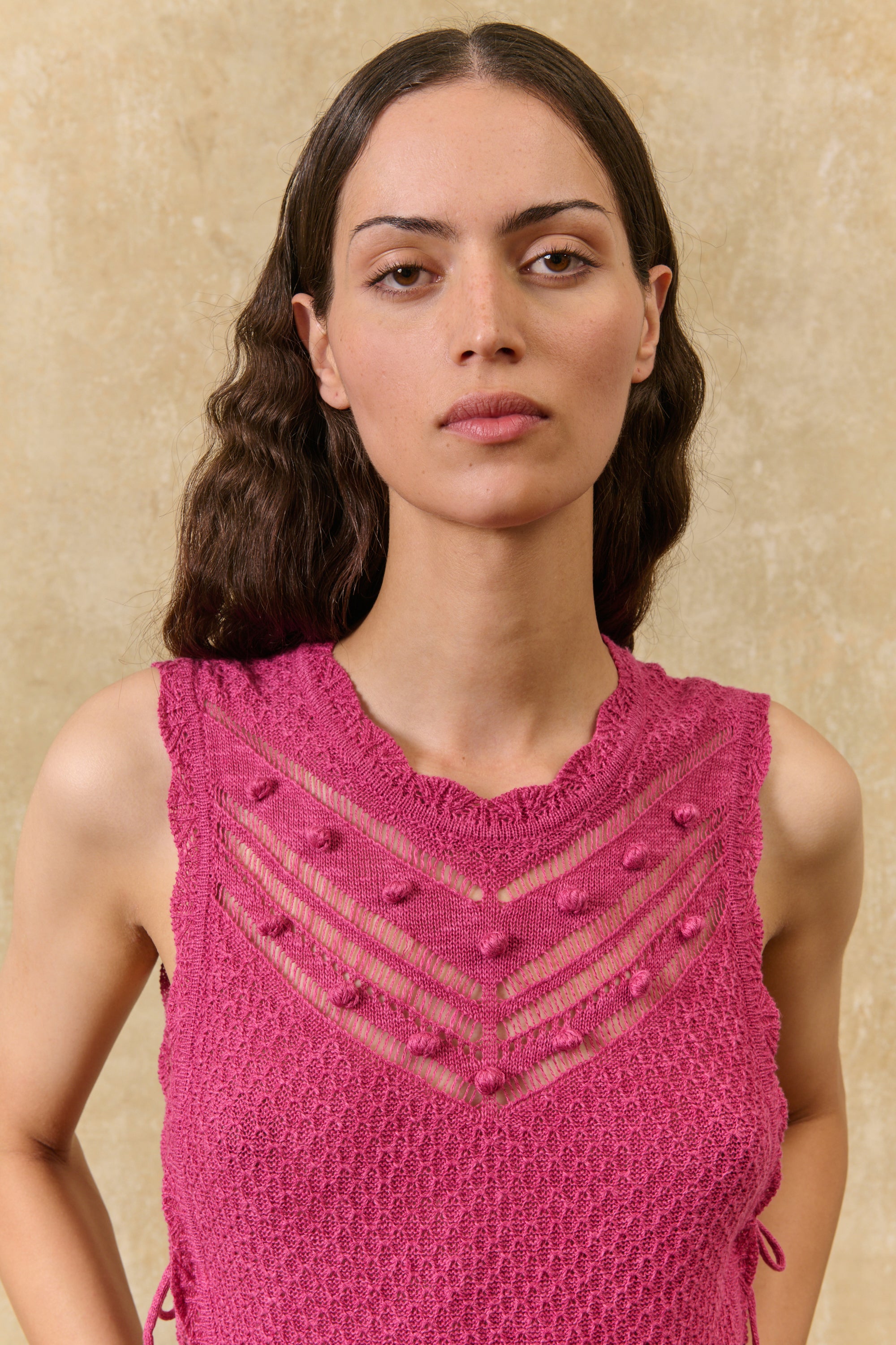 Emmanchures profondes jusqu’à la taille avec liens à nouer à deux niveaux.