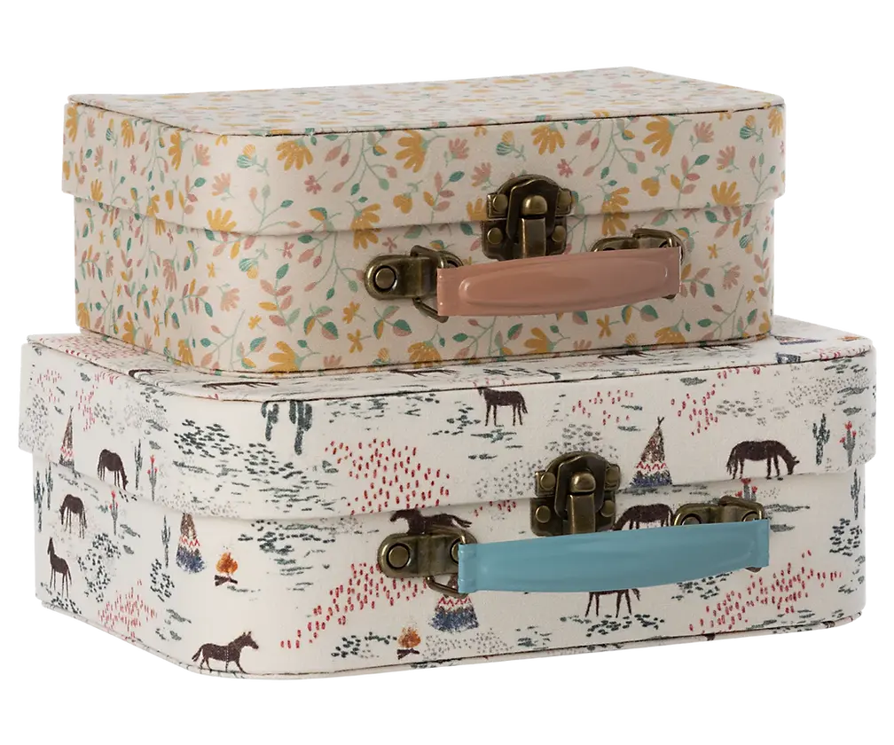 Ensemble de valises idéal pour ranger vos objets préférés. Chaque valise est recouverte d'un tissu Maileg unique et dotée de poignées métalliques colorées. Ce lot de 2 pièces est parfait pour ranger et transporter vos jouets ou accessoires avec élégance et praticité.