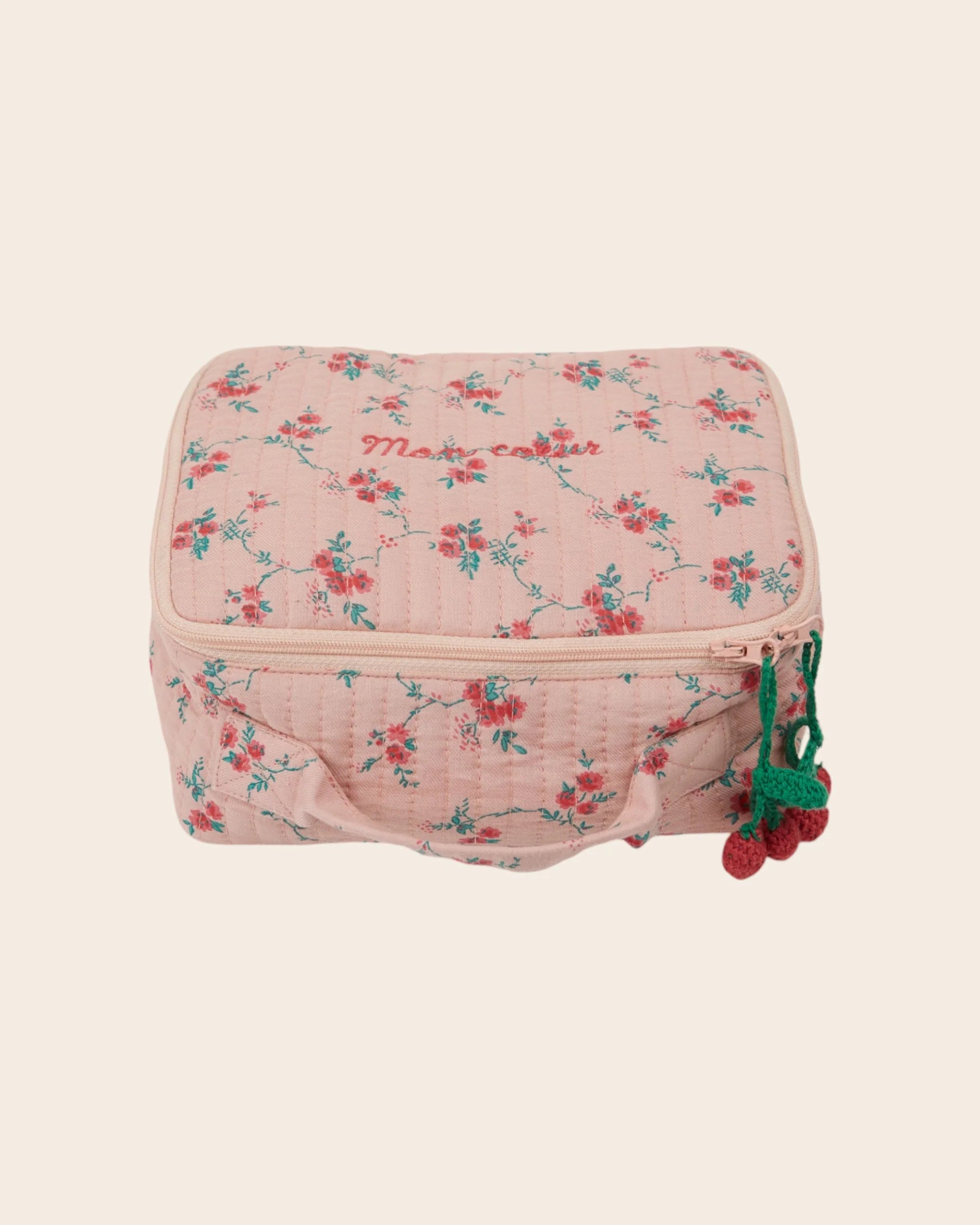 Trousse de naissance en flanelle de coton molletonnée, imprimée de bouquets fleuris sur fond rose. Une broderie rose " Mon Cœur " égaye le dessus de la mallette.