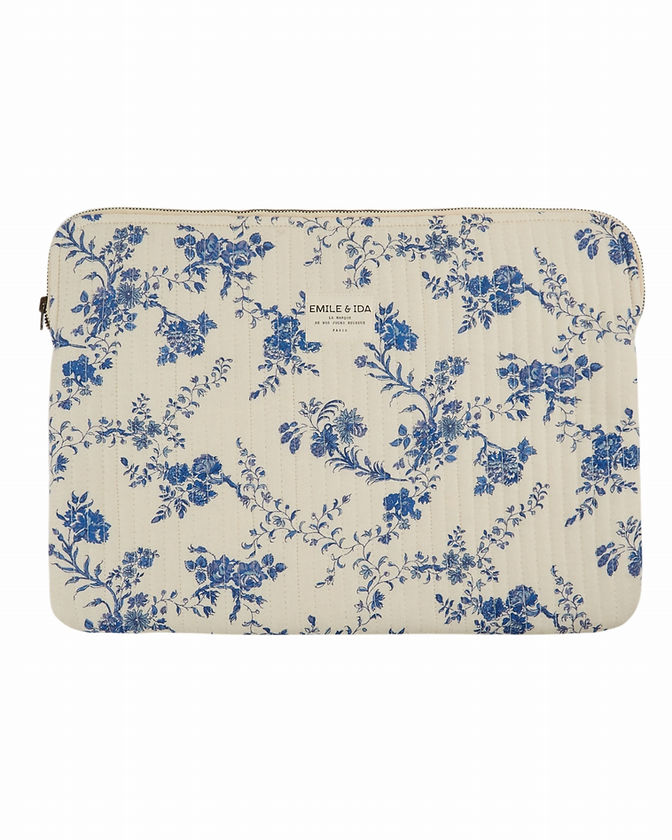 Pochette d'ordinateur écrue en coton molletonné, parsemé de fleurs bleues.