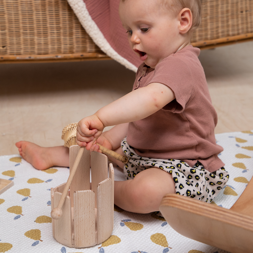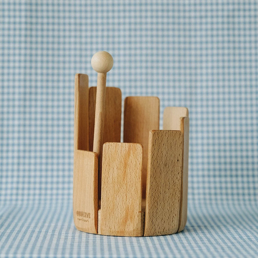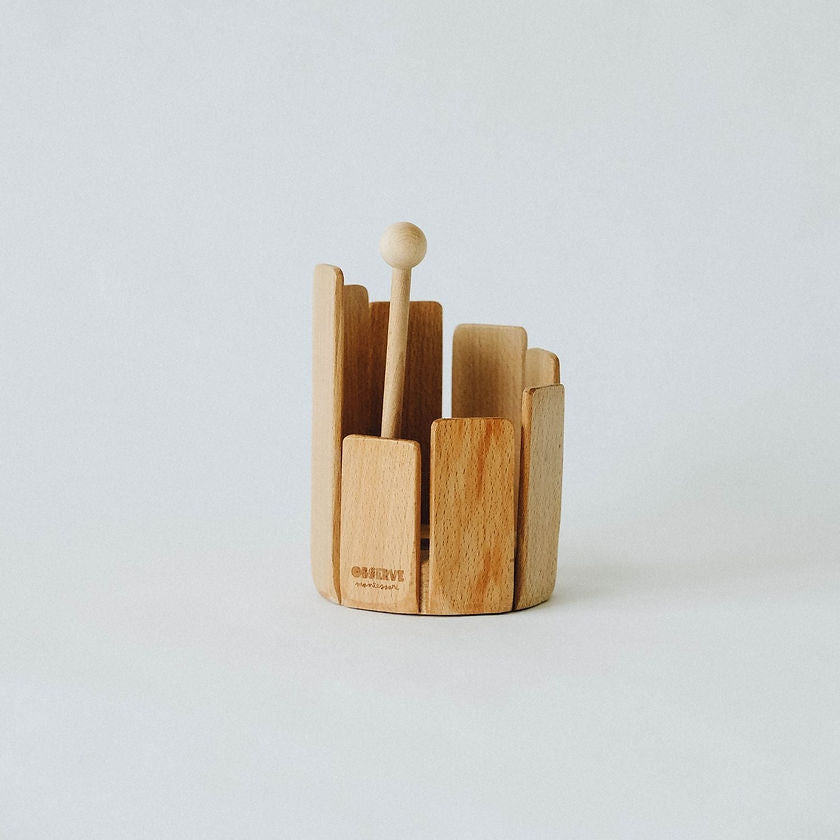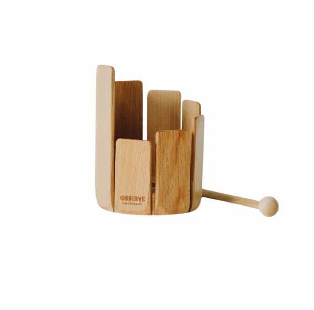 Comment l'utiliser ? L'Octoblock est un instrument de percussion mélodieux et facile à utiliser. Il se joue en faisant tourner la baguette à l'intérieur du cadre en bois.