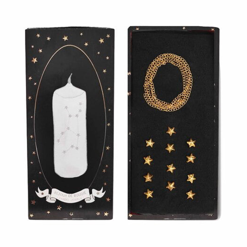 Coffret de bijoux de bougie à planter dans tous les supports en cire, contenant 12 étoiles, une chaine en laiton et une notice d'utilisation.