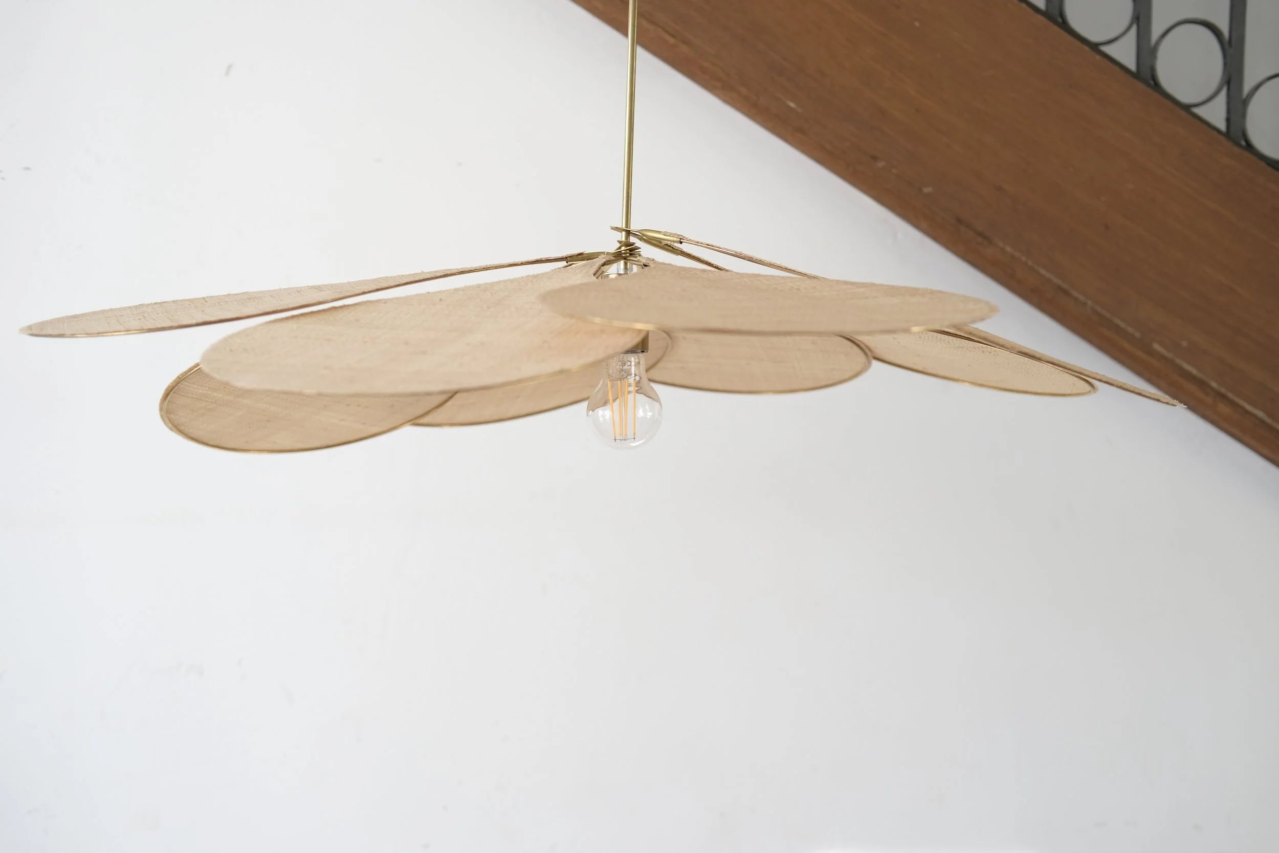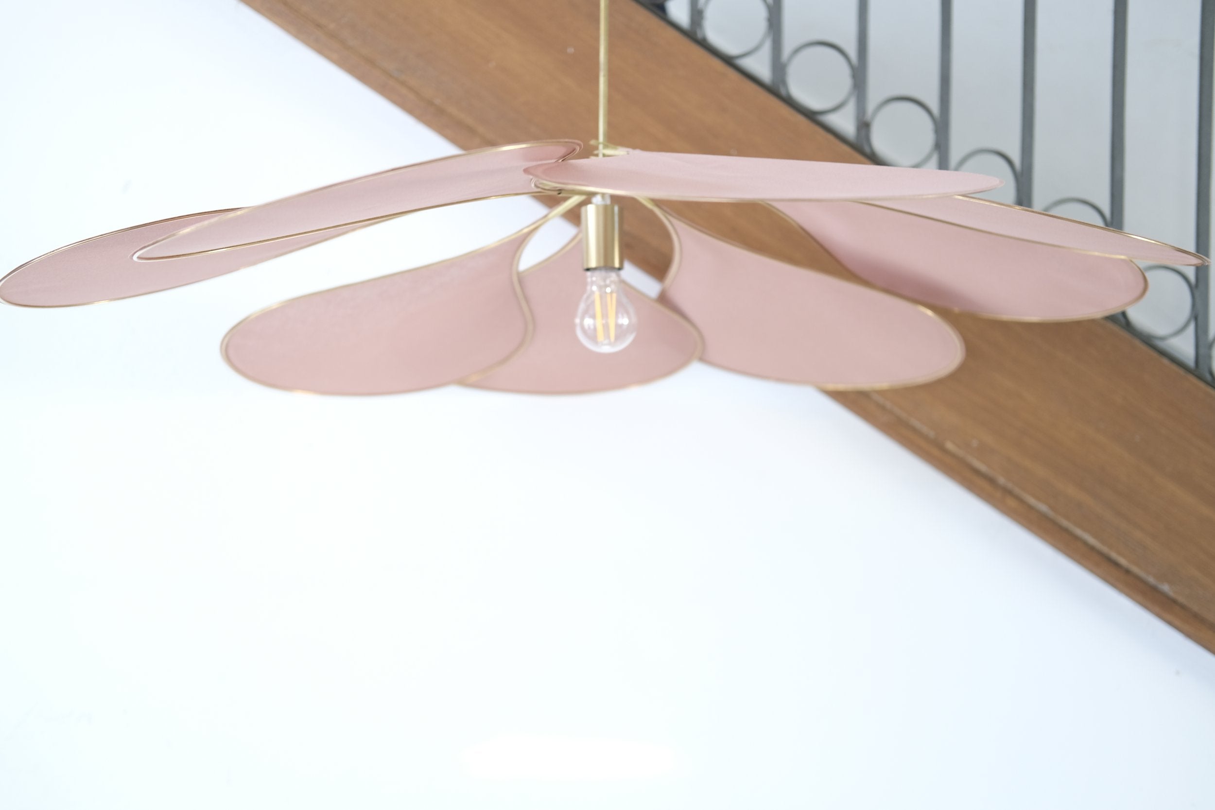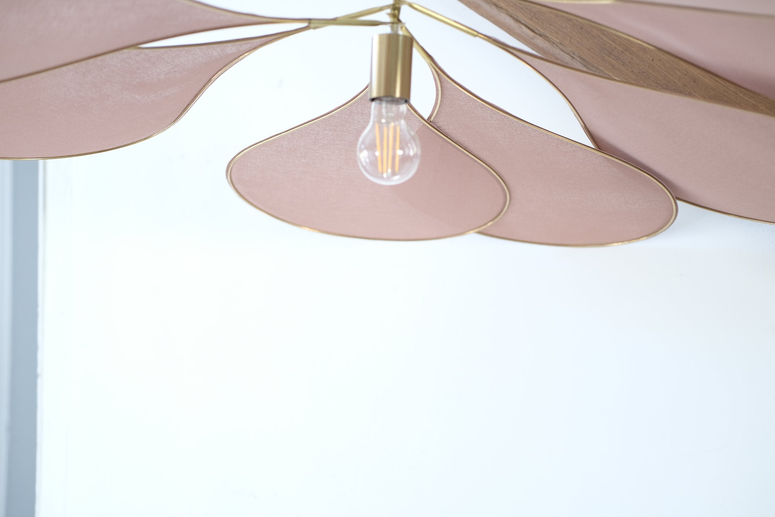 La suspension Pale est composée de huit pétales. Dans cette version en laiton, chaque élément est travaillé pour conserver une forme stable et parfaitement plane au fil du temps. Cette finition offre un rendu plus structuré que le modèle originel en rotin, dont les pétales se courbent naturellement pour créer une silhouette plus enveloppante.