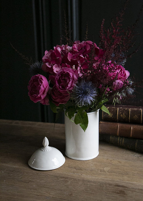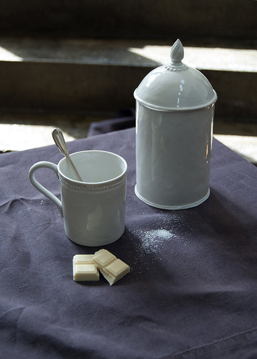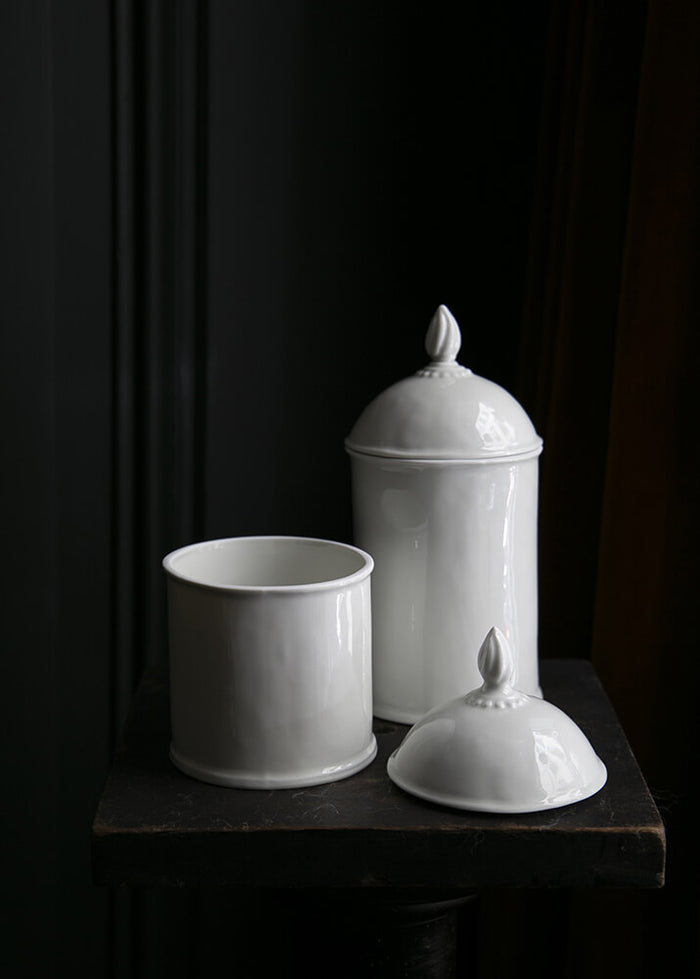 Le pot d'apothicaire est désormais davantage recherché pour son aspect décoratif que pour ses vertus de conservation. Le pot d'apothicaire en porcelaine blanche Alix D. Reynis est fabriqué au sein de la manufacture familiale de Limoges grâce au savoir-faire ancestral de nos artisans. Polyvalent, cet élégant contenant, accompagné de son couvercle sculpté, peut être utilisé pour conserver épices, petits trésors, ou simplement pour sublimer votre décoration intérieure.